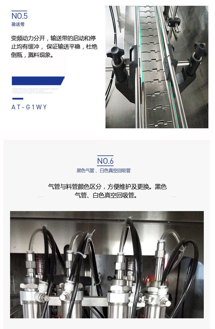 該六頭柱塞式全自動潤滑油灌裝機特的灌裝頭設計及真空回吸系統(tǒng),確保灌裝過程無殘油滴漏,快慢雙速灌裝,灌裝速度可調,杜絕溢瓶現(xiàn)象。該機采用動力灌裝,無需配裝高位罐,簡化了安裝工序,提高了灌裝效率。履帶式壓蓋機,穩(wěn)定無噪音,無空壓現(xiàn)象。觸摸屏界面友好,操作簡捷,SIEMENS PLC控制系統(tǒng),運算速度快,性能穩(wěn)定,品質卓越。電、氣件均采用精品元件,確保整機運作穩(wěn)定。