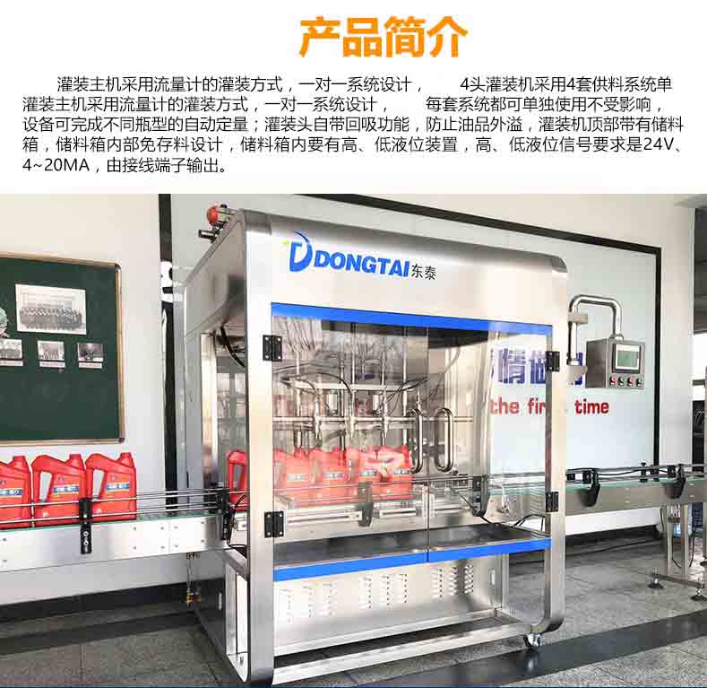 全自動(dòng)潤滑油灌裝主機(jī)采用流量計(jì)的灌裝方式,一對一系統(tǒng)設(shè)計(jì),4頭灌裝機(jī)采用4套供料系統(tǒng)單灌裝主機(jī)采用流量計(jì)的灌裝方式