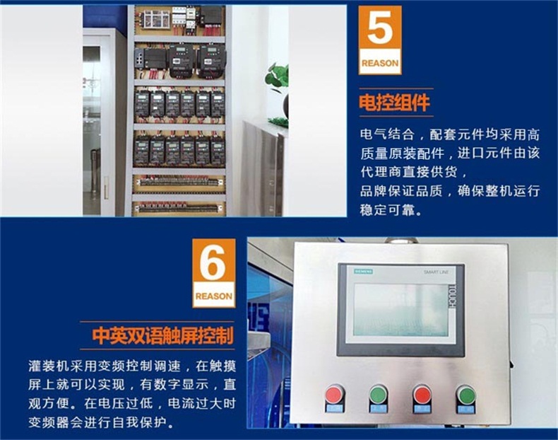 7.其他廠家采用調(diào)速電機(jī),靠手動(dòng)旋轉(zhuǎn)電機(jī)上的轉(zhuǎn)輪來改變輸送帶的速度,調(diào)整只能憑感覺極為不方便。我們的灌裝機(jī)采用變頻控制調(diào)速,在觸摸屏上就可以實(shí)現(xiàn),有數(shù)字顯示,直觀方便。在電壓過低,電流過大時(shí)變頻器會(huì)進(jìn)行自我保護(hù)。