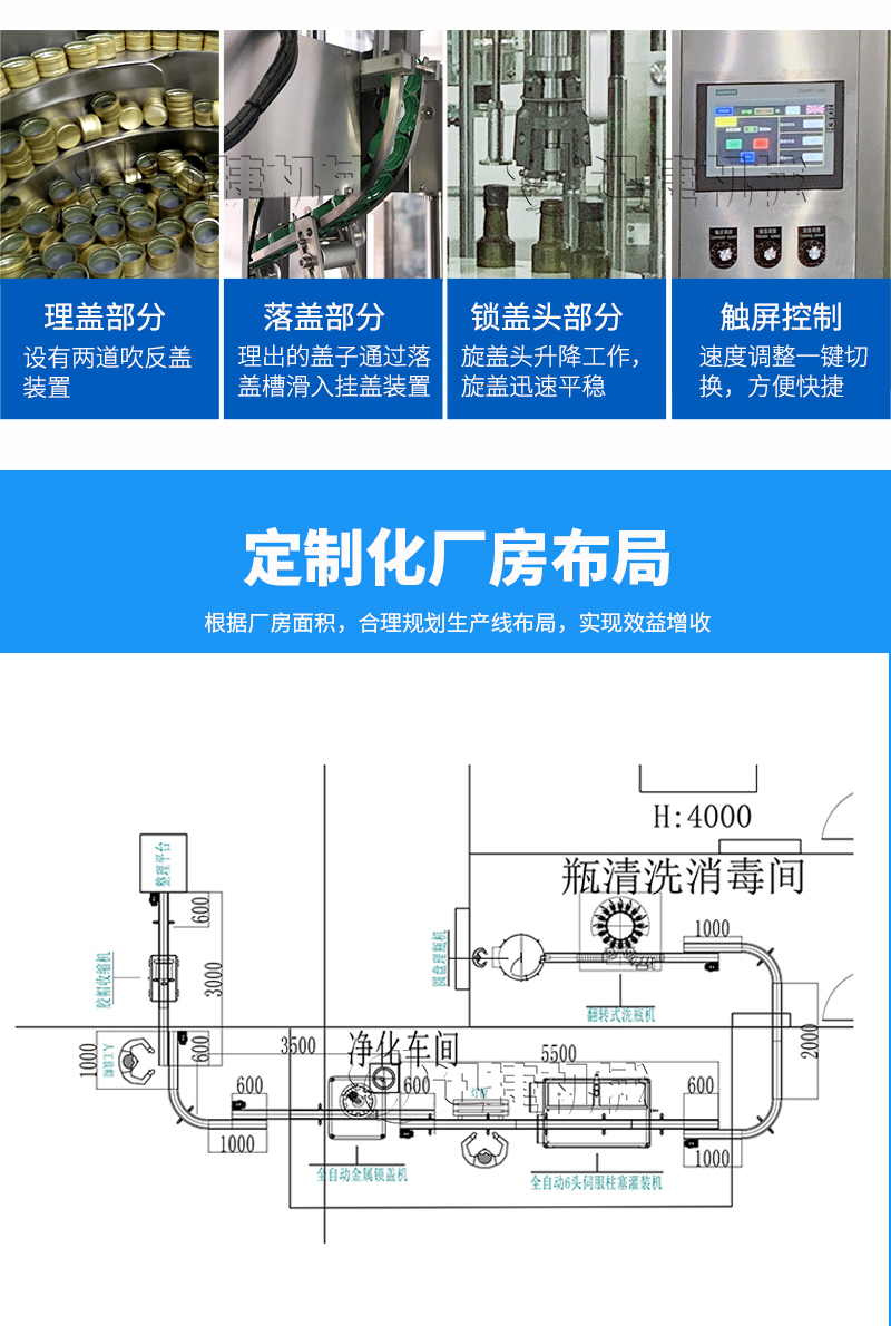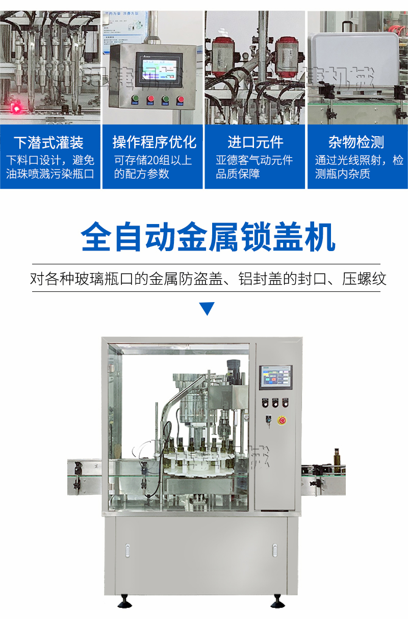 本設(shè)備適用于醫(yī)藥、農(nóng)藥、食品、化妝品、化工等行業(yè),主要針對各種玻璃瓶口的金屬防盜蓋、鋁封蓋的封口、壓螺紋等。該設(shè)備可單機使用,也可以與灌裝機等設(shè)備組成生產(chǎn)流水線自動作業(yè);