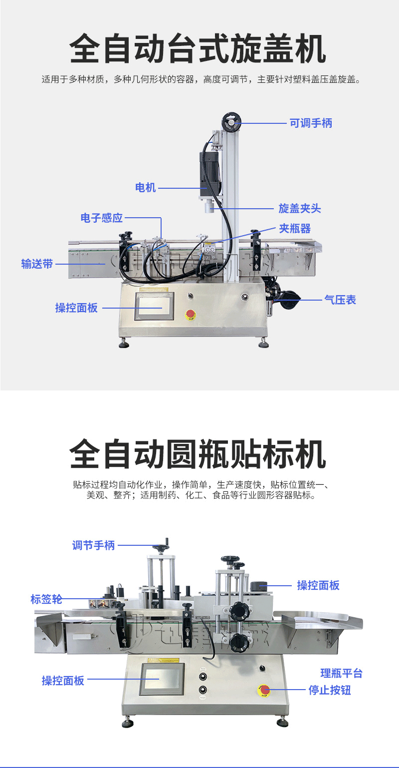 產(chǎn)品說明:桌面型膏液灌裝生產(chǎn)線根據(jù)灌裝范圍選擇型號,灌裝部分為雙頭下潛式灌裝機,適用于不同物料不同瓶子的灌裝,配備自動壓蓋機和圓瓶貼標機,可實現(xiàn)不同蓋子的旋蓋貼標工作。