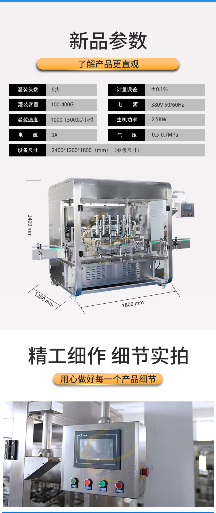 辣椒醬灌裝機(jī)采用活塞式灌裝原理,適用于調(diào)味品中帶顆粒并且濃度較大的辣椒醬、豆瓣醬、花生醬、香菇醬、果醬、牛油火鍋底料、紅油火鍋底料、蝦醬等較為粘稠醬類的灌裝。