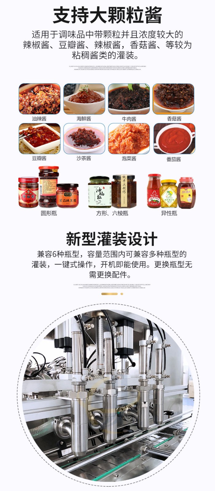 全自動四頭辣椒醬灌裝機(jī)適合中小口徑三旋、四旋玻璃瓶調(diào)味醬的分裝,適合醬料、含顆粒黏稠物料的灌裝,物料接觸部分均采用