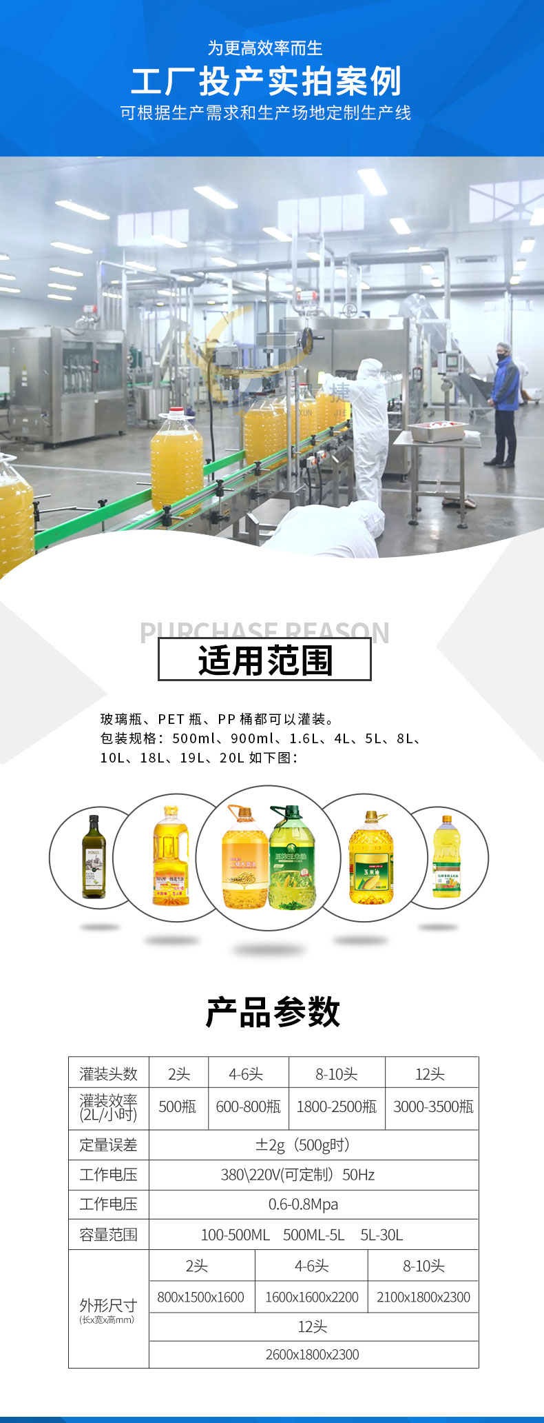 全自動(dòng)食用油灌裝機(jī)適用于玻璃瓶、PET瓶、PP桶都可以灌裝。包裝規(guī)格:500ml、900ml1.6L、4L、5L、8L、10L、18L。
