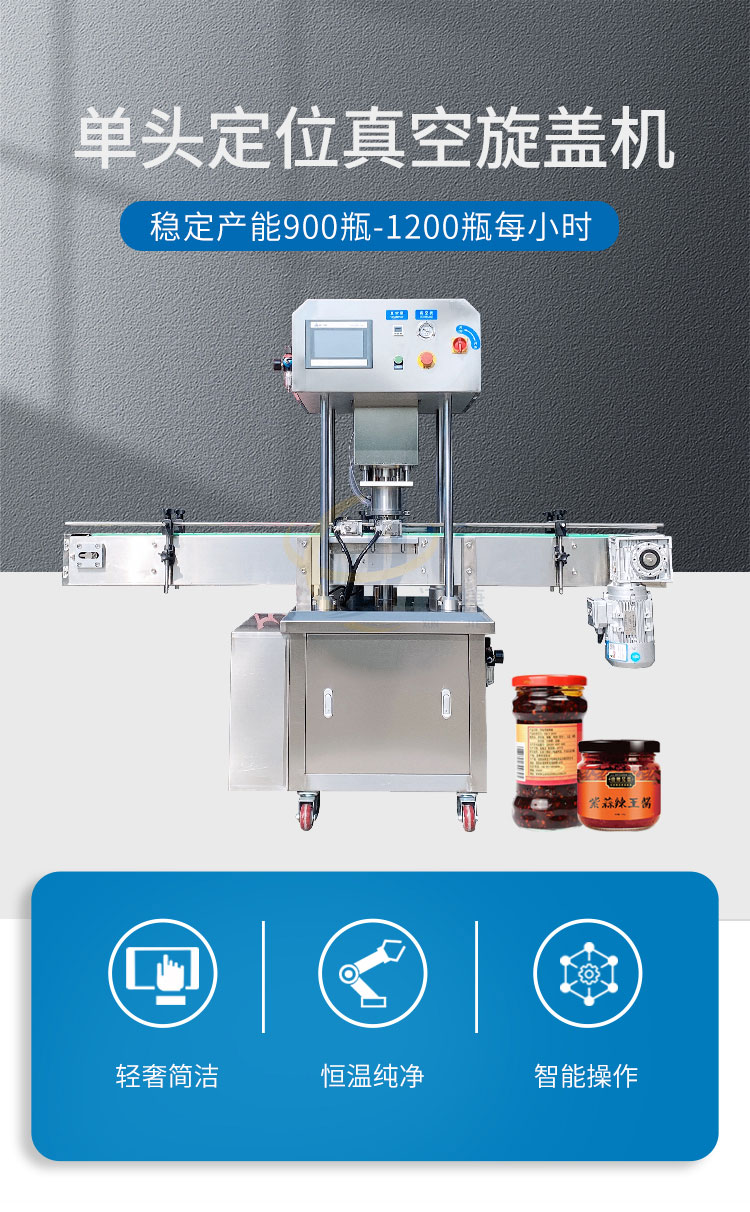 單頭定位真空旋蓋機(jī)適用多種瓶型。通過更換模具,即可適合于不同形狀、尺寸瓶子的真空旋蓋,換產(chǎn)方便。