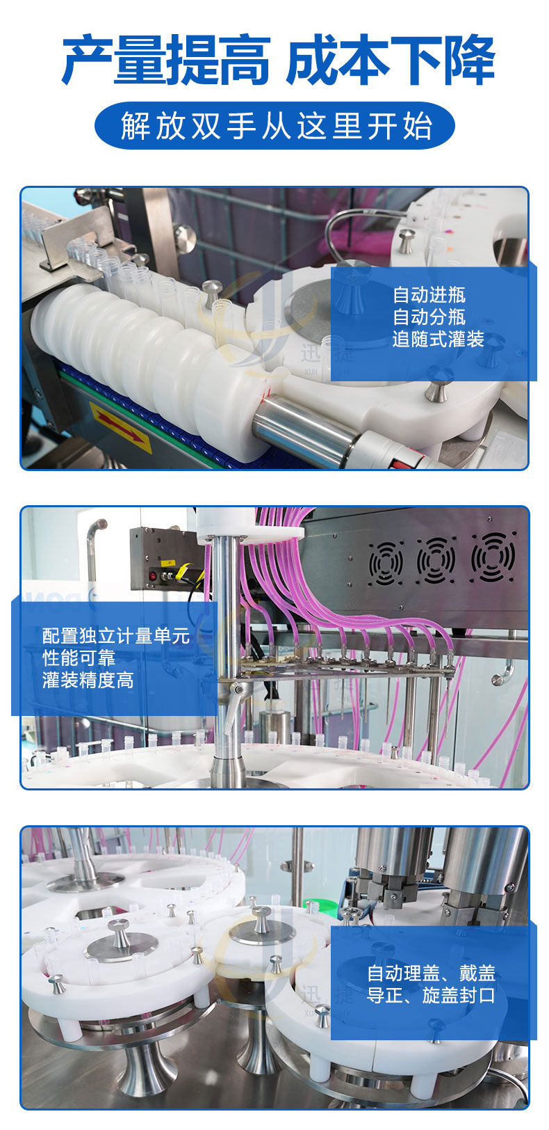 全自動診斷試劑灌裝旋蓋生產線由理瓶器整理成列,逐個送入進管絞龍,并自動進入等分盤中,等分盤作不同等分的間歇運動。