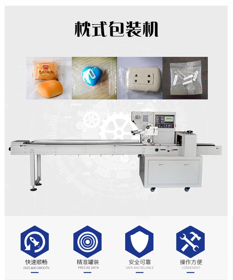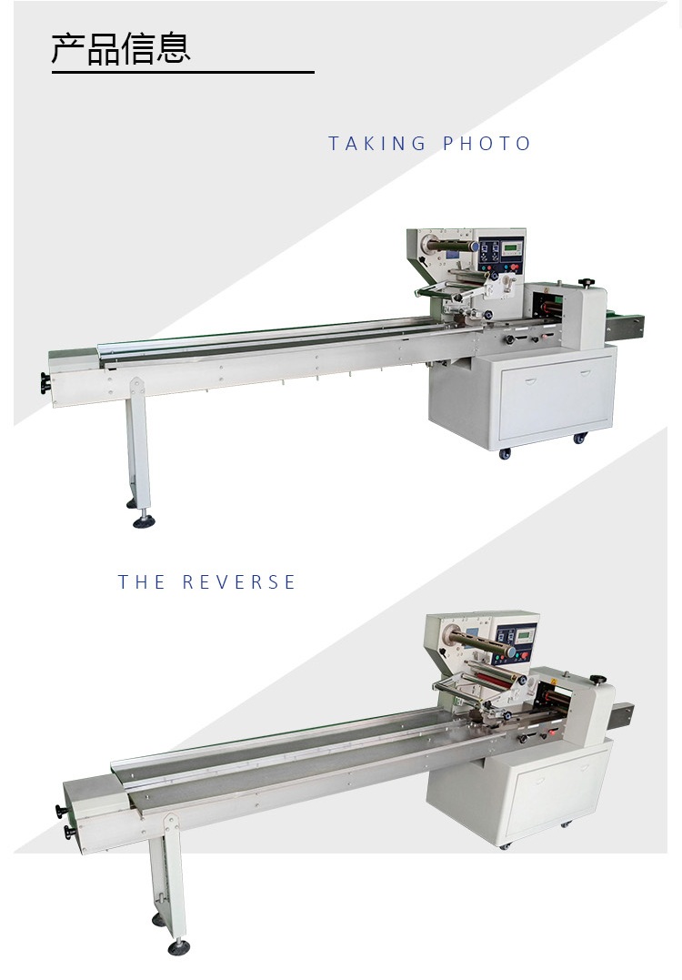 該枕式包裝機可用于餅干、月餅、蛋黃派、米餅、雪糕、方便面、巧克力等塊狀產品的包裝,特別適合于小批量單一產品的包裝。