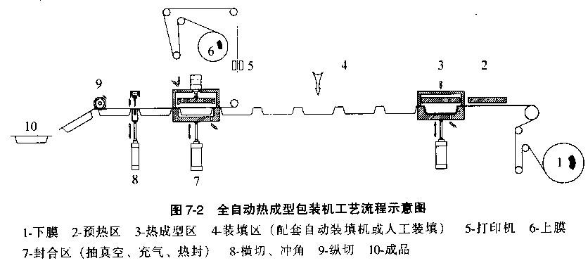 如下圖所示是全自動熱成型包裝機(jī)的包裝工藝流程示意圖。整機(jī)采用連續(xù)步進(jìn)的方式,由下卷膜成型, 上卷膜作封口。